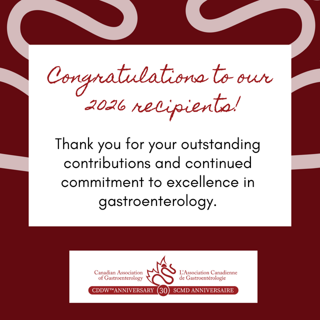 The Canadian Association of Gastroenterology (CAG) congratulates the 2026 CAG Award recipients! These exceptional individuals have made a significant impact to gastroenterology and digestive health in Canada, demonstrating outstanding contributions and dedication to research, education, clinical excellence, and leadership in our field. Their achievements help advance patient care and strengthen the GI community.